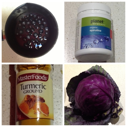 Purple = Blueberries (I used frozen) Boil them in some water, strained out the berries then used that in place of boiled water in the recipe.